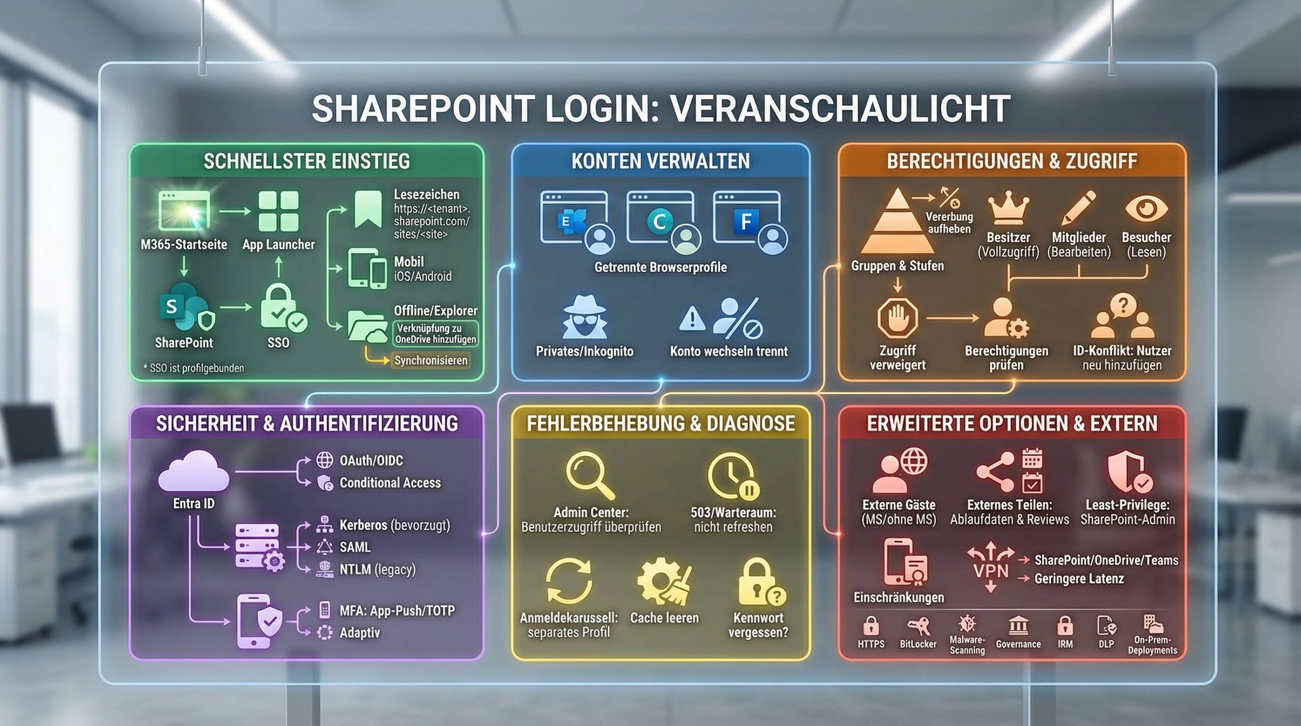 In diesem Leitfaden zeige ich dir Schritt für Schritt, wie du dich zuverlässig bei SharePoint anmeldest, mehrere Konten sauber trennst, Berechtigungen verstehst, Sicherheitsstandards umsetzt und typische Login-Probleme behebst. Du bekommst außerdem Best Practices für Governance, Mobile, VPN/Remote, Sync und Administration – kompakt und direkt umsetzbar.